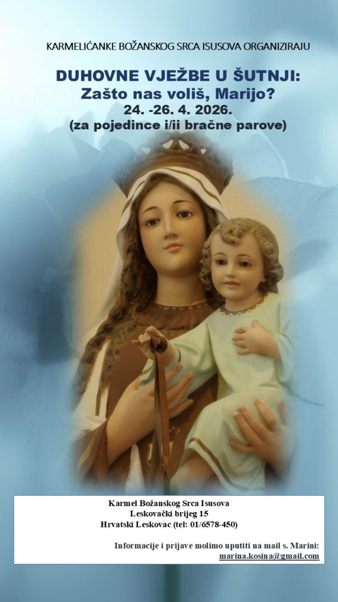 Sestre karmelićanke Božanskog Srca Isusova organiziraju duhovne vježbe u šutnji pod nazivom „Zašto nas ljubiš, Marijo? Program za pojedince i/ili bračne parove će se održati od 24.-26. 4. 2026., u duhovnom centru sestara u Hrvatskom Leskovcu. Duhovne vježbe traju od petka u 19 sati do nedjelje u 15 sati. Odvijaju se u karmelskom ozračju mira i sabranosti.