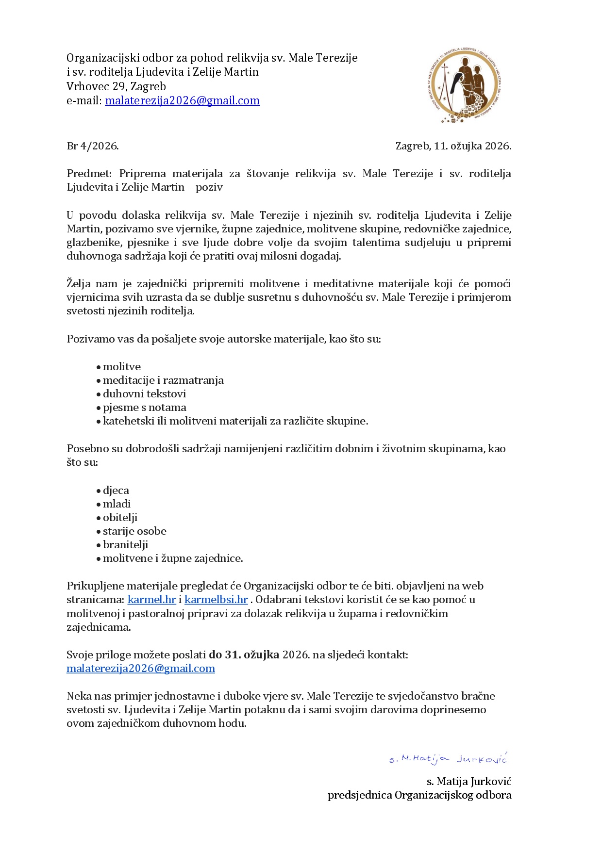 Ususret pohodu relikvija sv. Male Terezije i sv. roditelja Ljudevita i Zelije Martin Hrvatskoj, BiH i Srbiji Organizacijski odbor poziva sve zainteresirane za priprema materijala za štovanje relikvija. Autorske materijale možete poslati prema uputama u pozivu, više ovdje: